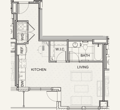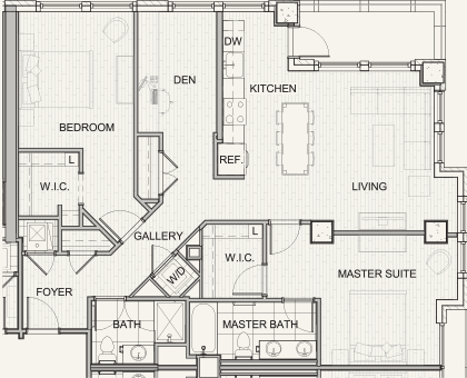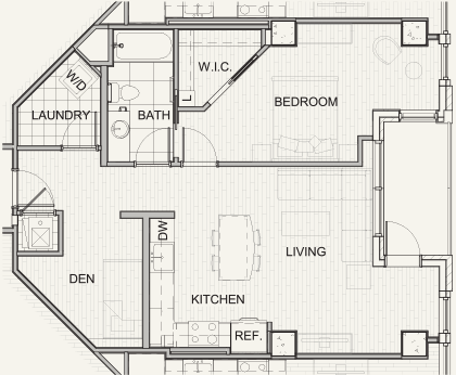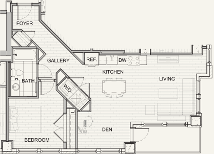 This one bedroom + den corner apartment is a spacious 877sf with a private balcony overlooking the garden terrace. Walk-in closet, large entry way, stainless appliances including washer & dryer are just some of the amenities.